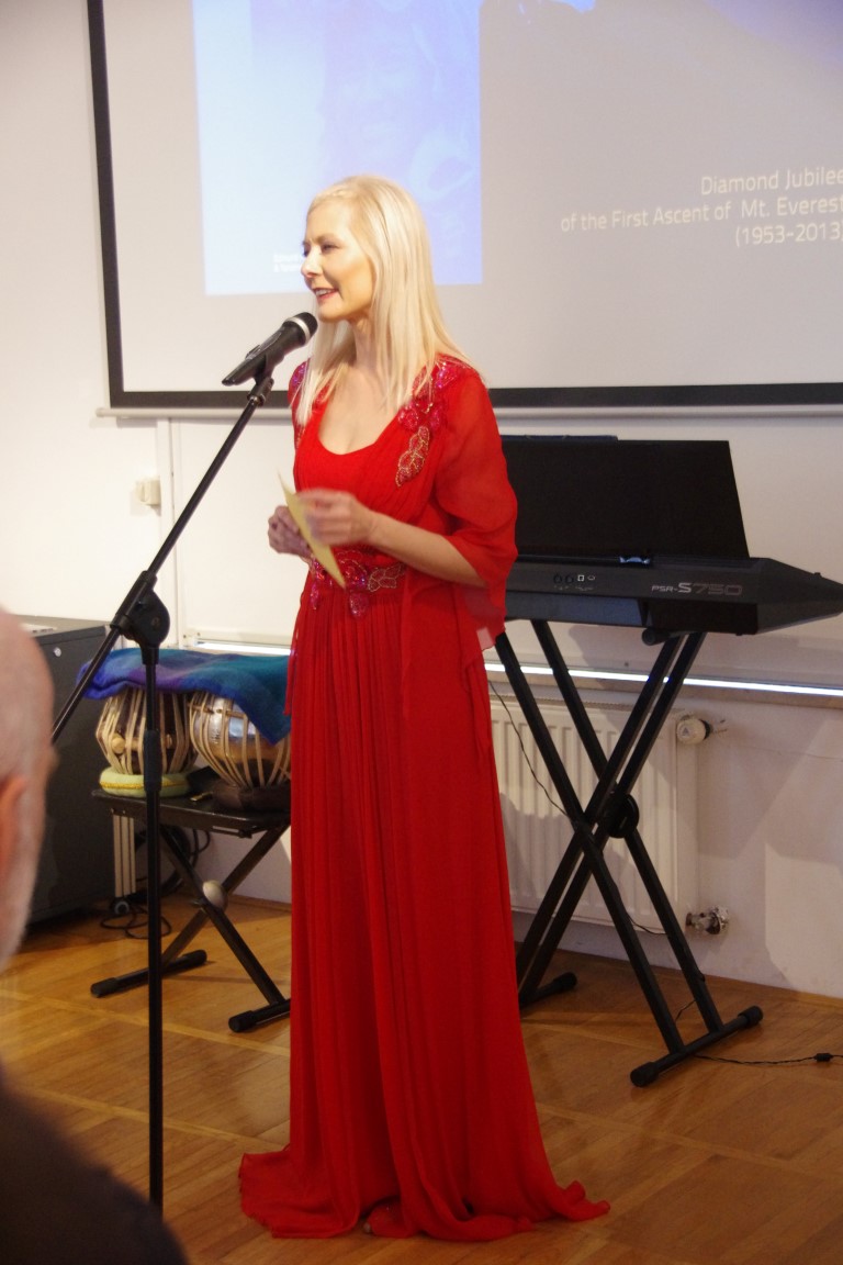Then followed a beautiful favorite Nepali song of Slovene Mountaineers sang by Dr. Lasanthi Manaranjanie with the background of Nepali lyrics played by her Ansamble. She entertained the audience then with another beautiful folk song from Sri Lanka.