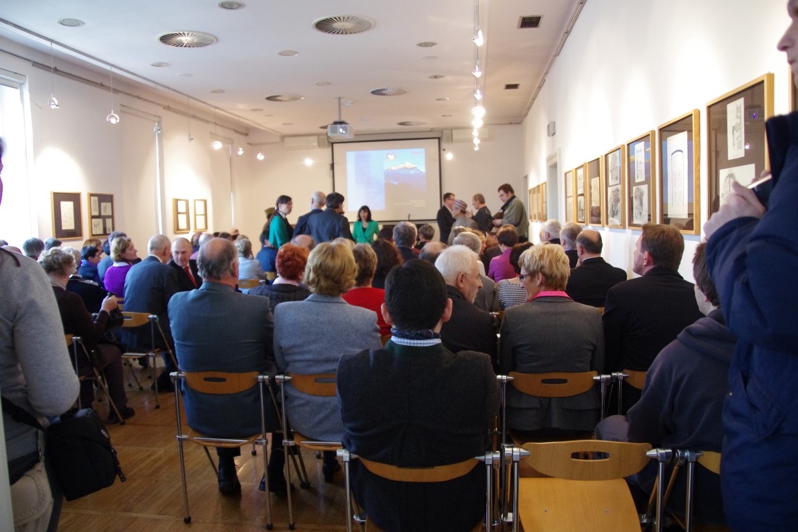 Mr. Marko Lakovič, Head of the Cultural Programme of the Library invited Mr. Shrestha to address the guests. First of all he thanked Ms. Teja Zorko, Director of the Library in hosting the solemn event Nepali Evening at the beautiful premises of her library. He further expressed great satisfaction that the event was participated by such a huge number of participants (approx. 200) especially so many VIP guests such as: Hon’ble Minister of Culture of the Republic of Slovenia Mr. Anton Peršak, H.E. Ambassadors of the USA, Albania and Georgia, Honorary Consuls of Croatia, Chile, Peru, Former Honorary Consul General of Philippines Mr. Jože Kastelič and Honorary Consul of South Korea Mr. Ivan Rudolf, Advisor for the Economic and Social Policy of the President of the Republic of Slovenia Ms. Helena Kamnar, the Representatives of the Foreign Ministry of Slovenia, Hon’ble Mayors, Former Minister for Health and current President of the Red Cross of Slovenia Mr. Dušan Keber, Vice President of the Alpine Association of Slovenia-PZS Mr. Miro Eržen, Former President of PZS and alpinist Mr. Franc Ekar, number of other Alpinists and friends of Nepal from Slovenia. He mentioned that the main objectives of organizing the event is to celebrate “Nepali Evening” dedicated to the First Ascent of Mt. Everest as first couple in the world Mr. Andrej and Marija Štremfelj by Ms. Marija Štremfelj, talk on the ascent to the peak of Kanchenjunga Himalaya of Nepal and trekking around it by Mr. Andrej Štremfelj, the exhibition of the photos of Himalaya of Nepal by Mr. and Mrs. Štremfelj, Portraits of ethnic group Gurung by Mr. Marko Lakovič, Cultural Heritages and related to the Hindu Culture by Mr. Birman Shrestha and the drawings and paintings of the Cultural Heritages of Nepal by Ms. Petra Shrestha.