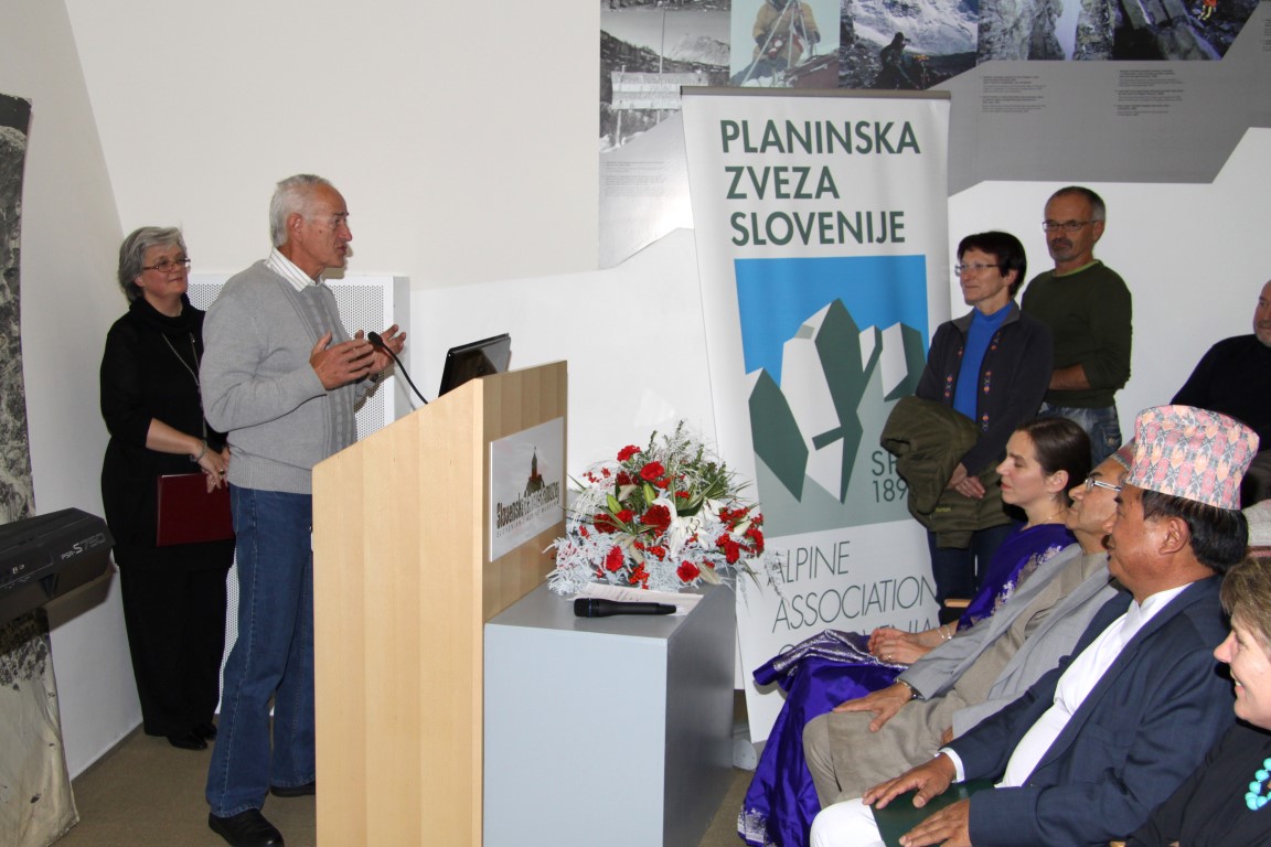 Mr. Shrestha then addressed in the name of Mr. Prakash Mani Poudel, Charge de Affairs of the Embassy of Nepal in Berlin, who regretted his participation and in his own name as a Honorary Consul General of Nepal in Slovenia and expressed his great satisfaction that he could share with so many dignitaries of the Ministry of Foreign Affairs and the Ministry of Education, Science and Sport of the Government of Slovenia, Slovene alpinists and the friends of Nepal at the premises of esteemed Slovenian Alpine Museum, Mojstrana. However, there had been read the message of Mr. Poudel about his apology, his sincere congratulations to the alpinists for their success in summiting to Makalu and appreciation to Mr. Shrestha for organizing the solemn event in cooperation with PZS, NMA and the Slovenian Alpine Museum. Mr. Shrestha expressed his sincere thanks and gratefulness to Madam Dr. Irena Lačen Benedičič, Director of the Museum and her team, especially Ms. Neli Štular, Curator for hosting that solemn event. Further he also stressed excellent cooperation between the Alpine Association of Slovenia (PZS) and the Consulate General of Nepal in Slovenia, among which the awarding of the recognition of the Ministry of Tourism and Civil Aviation of the Government of Nepal to all Slovene Mountaineers, who summated the Highest Peak of the World, Mt. Everest from the Nepal’s side two years ago in the “Year of Tourism 2011” at the premises of Slovene Ethnographic Museum, Ljubljana.
