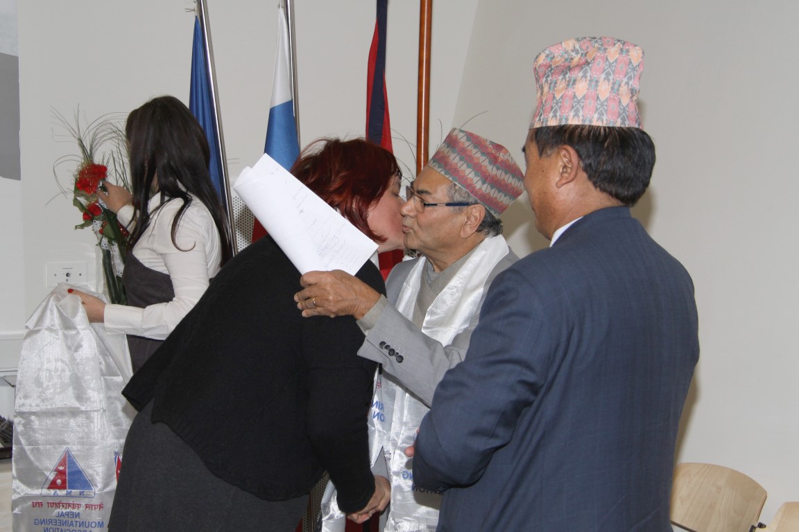 Slovenia having only two million populations has got 17 Mt. Everest summiteers and has been rated among the best Mountaineers in the World. The first expedition of then Yugoslavia respectively Republic of Slovenia to the Mt. Everest was organized under the leadership of Mr. Tone Škarja from Slovenia through the most difficult south direction of the Everest, which hasn’t been conquered by any expedition of the World so far. Mr. Andrej Štremfelj, Jernej Zaplotnik, Mr. Stane Belak from Slovenia, Mr. Stipe Božič from Croatia and Mr. Ang Phu Sherpa from Nepal had conquered the peak of the Everest in the expedition 1979. It is worth to point out some significant victory of the Slovene Mountaineers such as: Mr. Davo Karnicar as a fist Mountaineer in the World conquered the peak of the Everest and skied down to the bottom of the Everest at a time without break, Mr. Viki Groselj have conquered 10 eight thousand high mountains of the world out of 14 and Mr. Andrej Štremfelj and his wife Marija Štremfelj are the first couple in the world, who have conquered the peak of the Everest. Besides them four other Mountaineers of Slovenia: Mr. Tadej Golob, Matej Flis, Gregor lačen and Mr Tomaž Jakofčič have been awarded the recognition of the Ministry of Tourism and Civil Aviation of the Government of Nepal by Mr. Aswin Kumar Shrestha, Honorary Consul of Nepal in Slovenia in the accompany of Mr. Bojan Rotovnik, President of the Alpine Association of Slovenia, who presented the flowers to the summiteers and Mr. Zimba Zangbu Sherpa, President of the Nepal Mountain Association awarded them khata. Besides that Mr. Sherpa awarded the plackets of NMA to the Management and Leader of the Expedition as meritorious of organizing the expeditions to Himalaya in accompany of Honorary Consul of Nepal in Slovenia Mr. Shrestha to present flowers to the receivers of the plackets: Mr. Bojan Rotovnik, President of Alpine Association of Slovenia and its Former President Mr. Franc Ekar, Mr. Tone Škarja, Head of the committee for foreign mountains, Mr. Bojan Pollak, Head of the Training for Mountain Guides, Mr. Aleš Kunaver, Founder of Mountain School in Manang, Mr. Zoran Jerin, Journalist and Mountaineer writer of many books about Nepal, Mrs. Dušiča Kunaver, Collector of data and publication of many books on Slovene expedition and Translator of Folk Tales of Nepal. .
